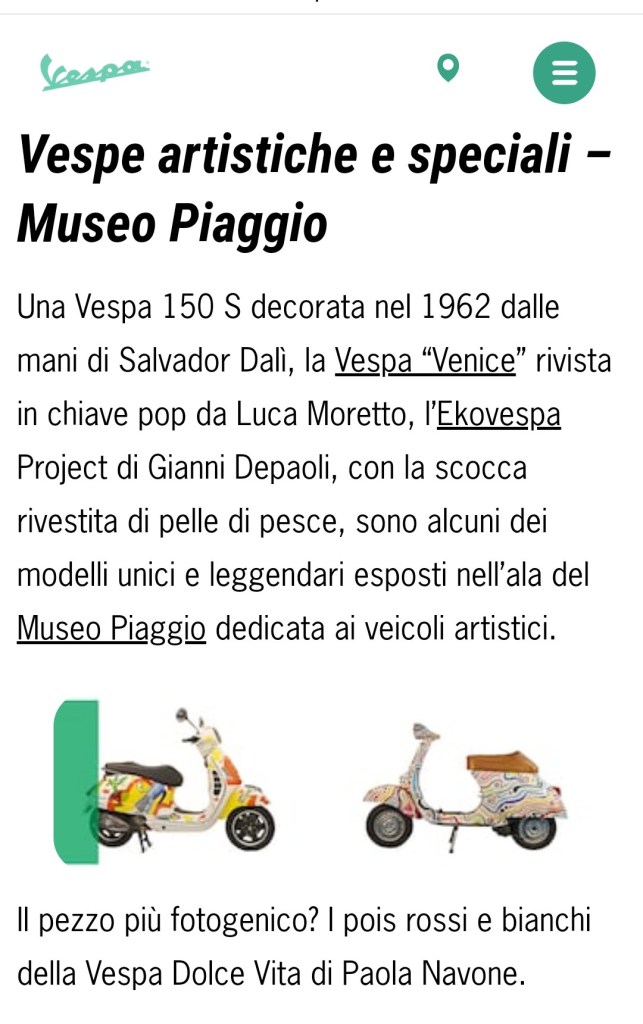 Ho così deciso di portare avanti il tema della già conosciuta Vespa Venice (ospite del Museo Piaggio dal 2012), usando gli stessi colori e stessa tecnica a rilievo…