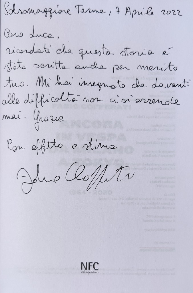 Oggi ho ricevuto questo omaggio dal buon Fabio Cofferati. Un libro che racconta il suo viaggio Milano-Tokyo, un’impresa di quasi 15.000 km a bordo di una Vespa degli anni 60!!! Un libro che man mano lo leggi ti fa sentire in sella con lui e ti fa sorridere per le avventure e gli aneddoti.
