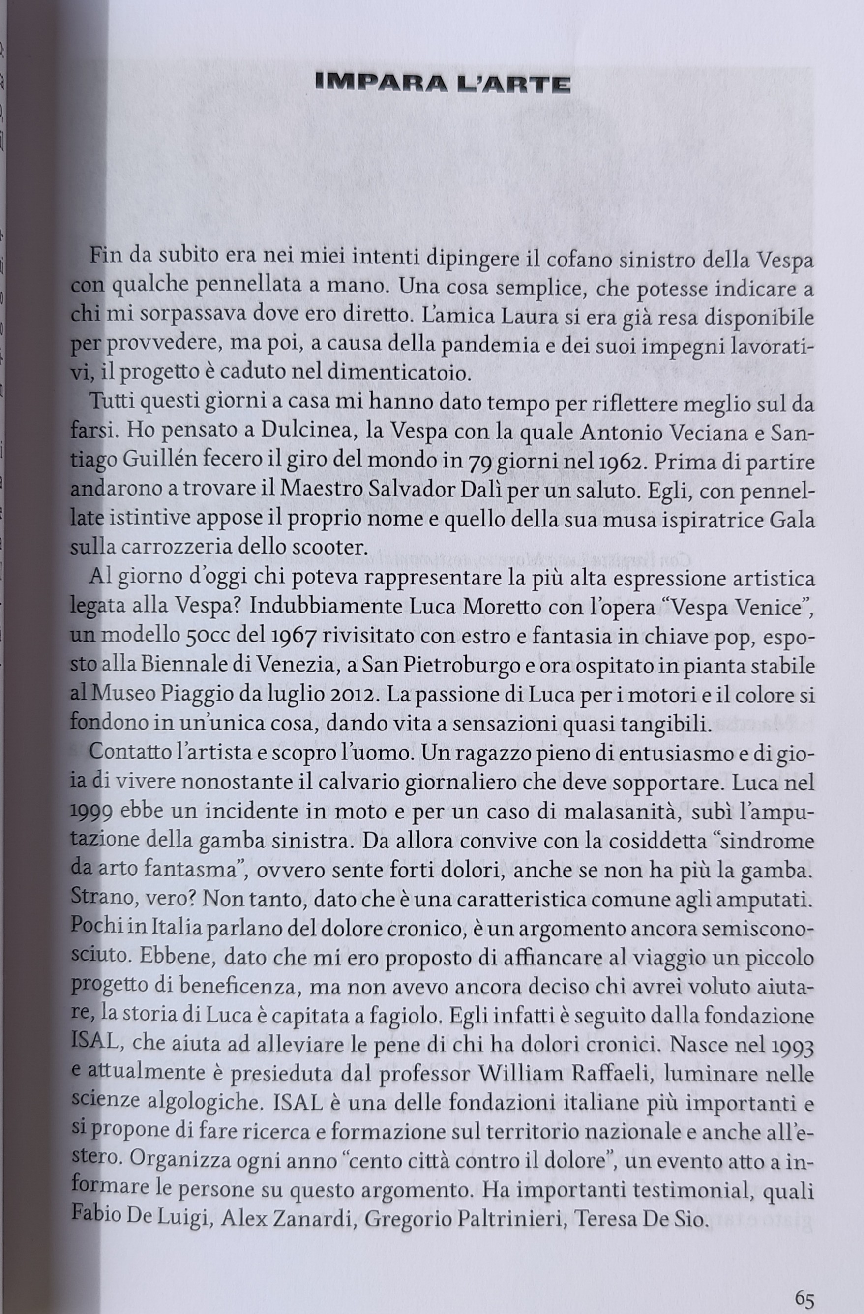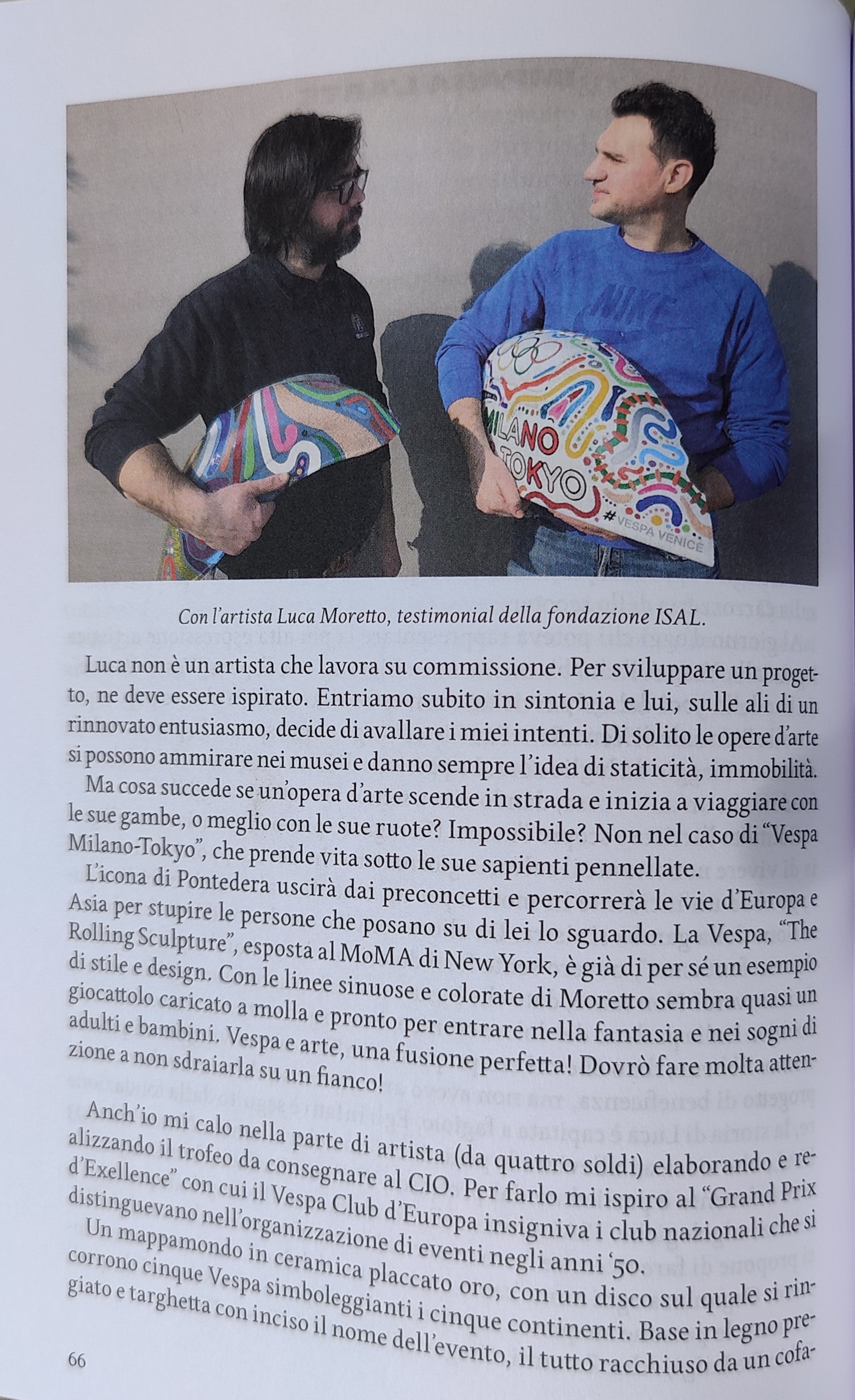 A giugno 2021, Fabio Cofferati è partito da Milano in direzione Tokyo percorrendo la bellezza di quasi 15.000 km, dalla quale la Vespa diventata una “Vespa d’arte” è tornata in Italia senza un graffio. Più che un viaggio, quella di Cofferati è stata un’avventura piena di insidie e sorprese, nonché aneddoti simpatici raccontati nel suo libro “Ancora in Vespa da Milano a Tokyo” – www.amzn.eu/d/8uH2hOn . Dalla vendita del libro, Cofferati devolverà una parte degli incassi alla Fondazione ISAL di Rimini che si occupa di curare e supportare gli ammalati di dolore cronico della quale Moretto è testimonial in quanto ammalato gravemente di sindrome da Arto Fantasma doloroso da quasi 23 anni. Quando Cofferati raccontò a Moretto la sua intenzione di coinvolgere una associazione o fondazione benefica, Moretto spiegò cosa fa ISAL, guidata dal suo presidente e fondatore, Prof William Raffaeli per i suoi pazienti e per il buon cuore e la sensibilità di Cofferati non c’è stato bisogno di altro per decidere che quella era la fondazione con cui creare un tema comune tra l’artista Veneto, Cofferati stesso e la fondazione ISAL