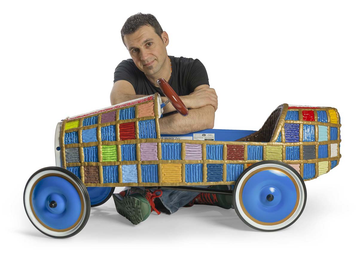 Anche le murrine di ispirazione veneziana, registrate come format Murrina Pop©, sono un tema frequente che caratterizza sia le opere su tela che i supporti scultorei, come la “Bugatti B35 Murrina Pop© Bronzorame/Blue”.
