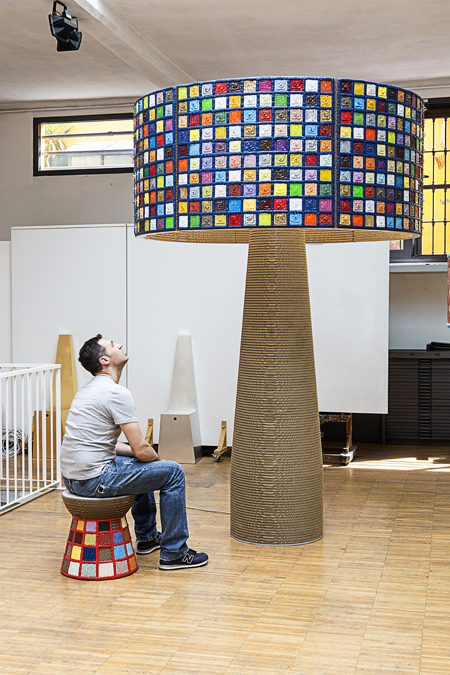 Le sedute e le lampade di cartone, materiale ecologico e “povero” della Staygreen viene nobilitato attraverso l’intervento artistico con silicone di Luca Moretto che, nel suo lavoro di ricerca, interviene su oggetti di uso quotidiano divenuti, per ragioni diverse, icone del contemporaneo.
